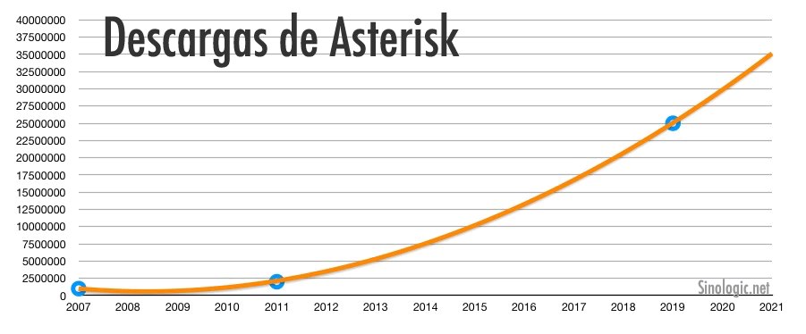 Ahora si, 8 años después, volvemos a celebrar los 25 millones de descargas de Asterisk, lo que implica una progresión prácticamente exponencial pese a que ahora hay mucha más competencia en cuanto a software y servicios de comunicaciones, pero hay mucha más demanda en cuanto a personas y empresas que requieren de sistemas de comunicaciones IP, lo que es algo perfectamente comprensible.