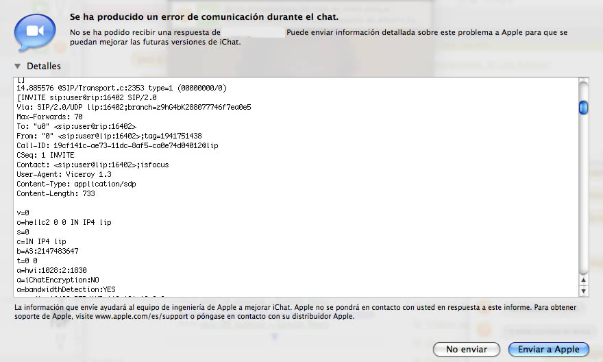 Intentando hacer una videoconferencia con un amigo a través del programa de mensajería del Leopard (Mac) veo que fallaba al iniciar la sesión y tras echarle un vistazo a los detalles me encuentro con esto: