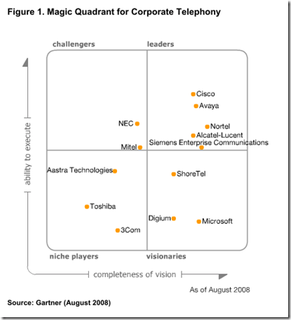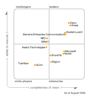 Pues bien, la noticia es que, dentro de las mejores empresas de telefonía para empresas entre las que se pueden encontrar nombres como Cisco, Nortel, Avaya, Alcatel y Digium (en 2008), en el nuevo estudio reciente, esta empresa acaba de posicionar a Digium dentro del cuadrante de las empresas Visionarias junto con Microsoft, Nortel y ShoreTel.