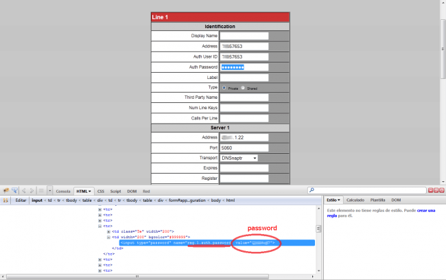 Para conocer los datos de la cuenta SIP, tan solo tenemos que acceder al interfaz web del terminal Polycom con los datos por defecto: «Usuario: Polycom» y «Contraseña: 456«, entrar en el apartado Lines -> Line1, y de ahí, buscamos en el navegador la opción para obtener el «Código fuente de la página web«. Veremos entonces algo como esto: