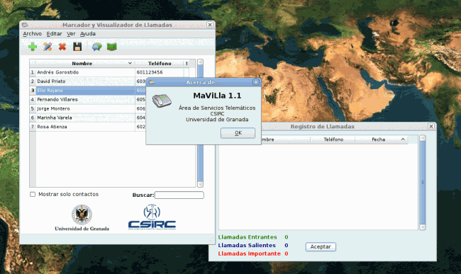MaViLla es una aplicación de código abierto con licencia GPLv3 escrita en C++ y que usa las librerías QT para construir la interfaz de usuario. Es una pequeña agenda que nos permite, además de tener nuestros contactos guardados en una base de datos local, realizar llamadas desde nuestro Teléfono IP sin necesidad de marcar el número, simplemente haciendo doble click sobre nuestros contactos. También visualiza información de las llamadas entrantes. Todo esto con ayuda del servidor de Telefonía IP ASTERISK, del servidor Web APACHE y del motor de Bases de Datos MySQL. En nuestra sección de descargas se puede obtener el código fuente.