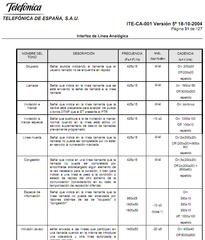 En el caso de una línea analógica, el documento que recoge toda la información estándar se puede encontrar públicamente en el siguiente enlace: http://info.telefonica.es/ext/interfaces/pdf/ITE-CA-001-V05.pdf