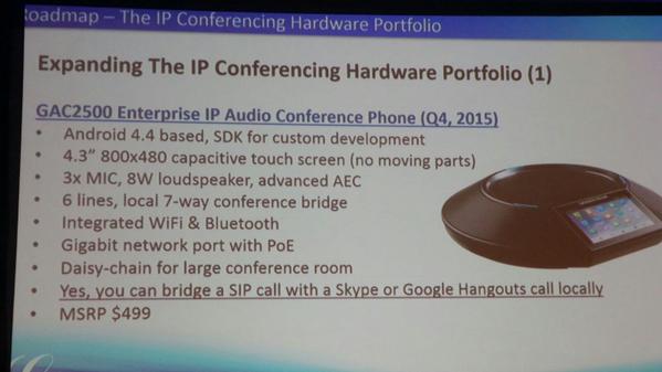 En el apartado de teléfonos de multiconferencia, para finalies de año, tendremos el nuevo Grandstream GAC2500, un teléfono con Android, 3 micrófonos, wifi y bluetooth para realizar conferencias en alta calidad que, además, soporta Skype y Google Hangout.