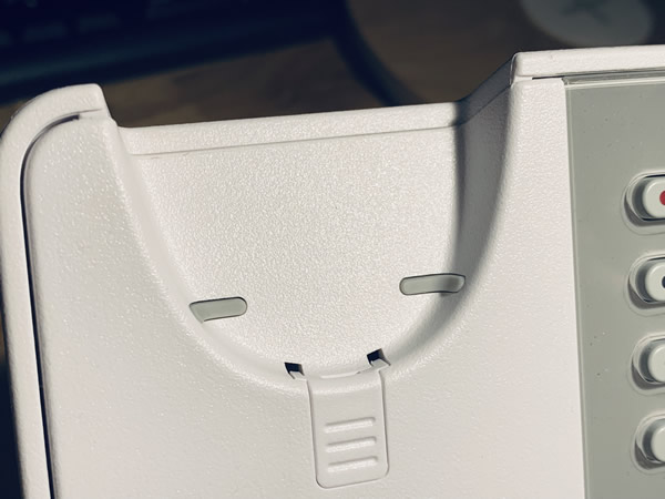 Esto puede parecer una tontería pero es una de las características que me gustan de los Snom. Esa pieza, por suerte o por desgracia, tiende a romperse más frecuentemente de lo que pensamos y por eso Snom lo eliminó en los modelos de alta gama sustituyéndolo por algo (suponemos) magnético de manera que, aunque no puedes colgar con la mano, sí que se cuelga cuando pones el auricular. Además, este hueco dispone de unas almohadillas de goma que evita hacer el típico ruido «clonck!» al colgar.