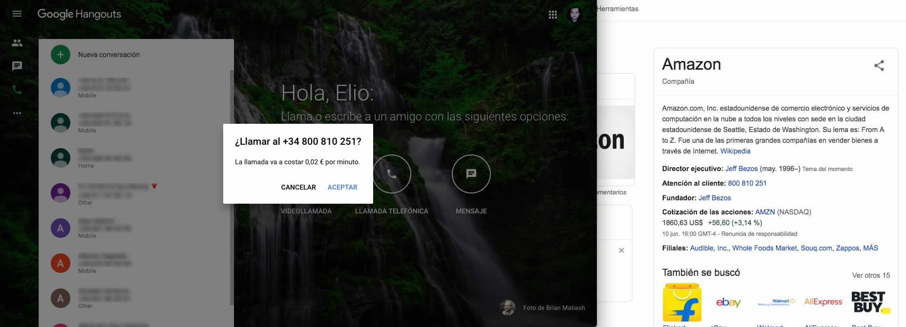Hacía tiempo que Google ofrecía hacer llamadas desde Hangout a números de nuestra agenda de contactos, pero activar su Hangout cuando se pulsa en un número de teléfono para poder llamar a números desde la página de los resultados, igual es cosa mía, pero me parece un poco aprovecharse de su posición dominante.
