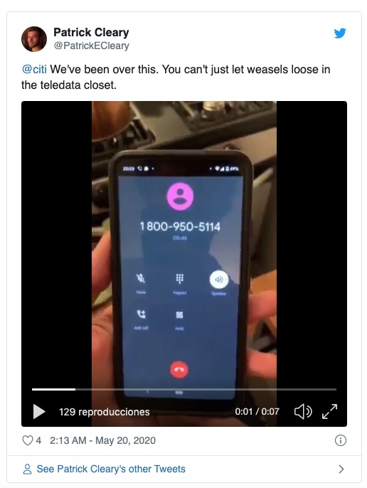 Según una nota de prensa del propio CitiBank: «Durante una actualización de mantenimiento, un error del proveedor desvió las llamadas de los clientes incorrectamente. El problema duró aproximadamente una hora y nos disculpamos por cualquier inconveniente. Y para que conste, las comadrejas no se han comido nuestro sistema telefónico«.