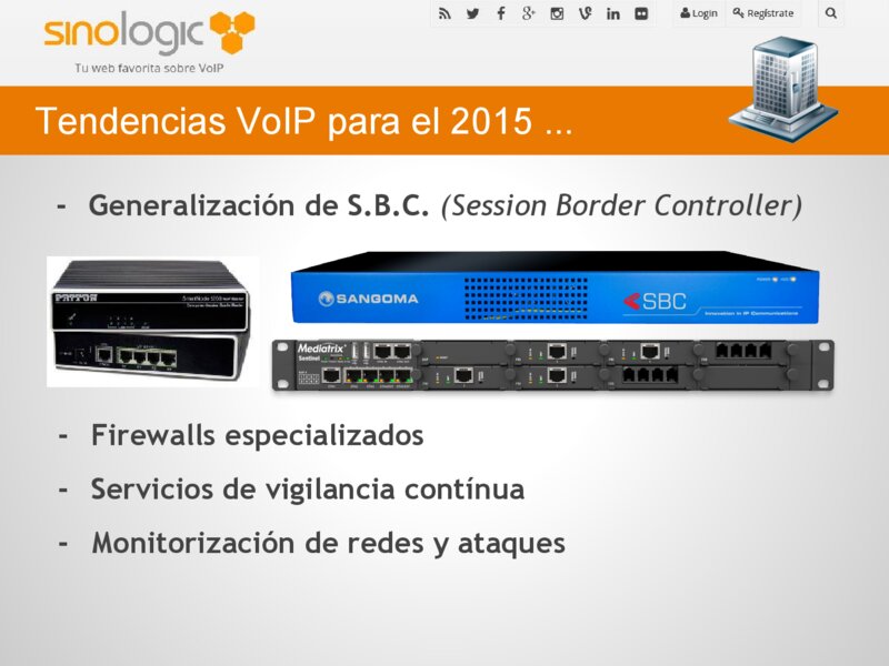 Tendencias VoIP para el 2015 ... - Generalización de S.B.C. (Session Border Controller) - Firewalls especializados - Servicios de vigilancia contínua - Monitorización de redes y ataques