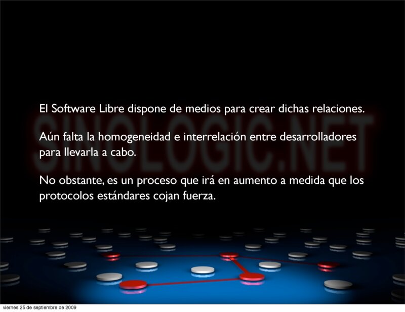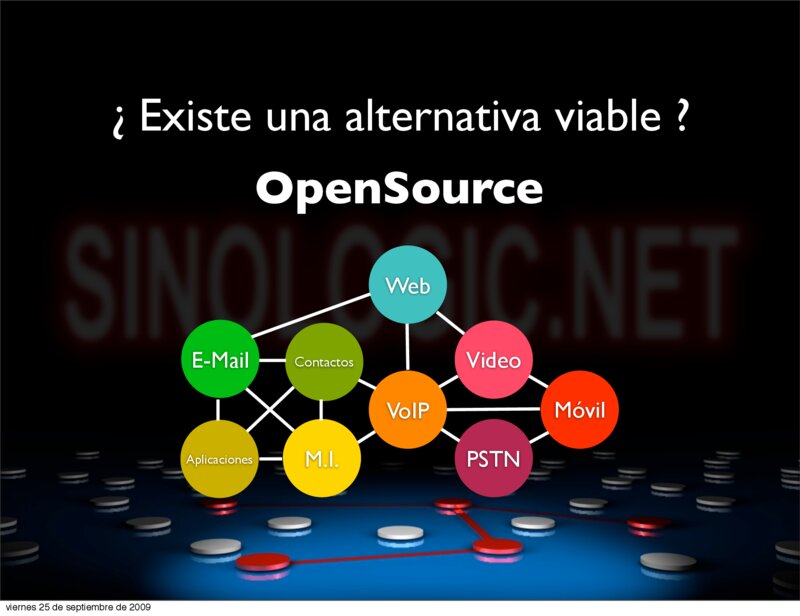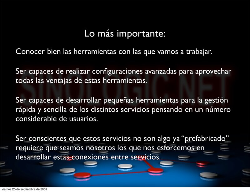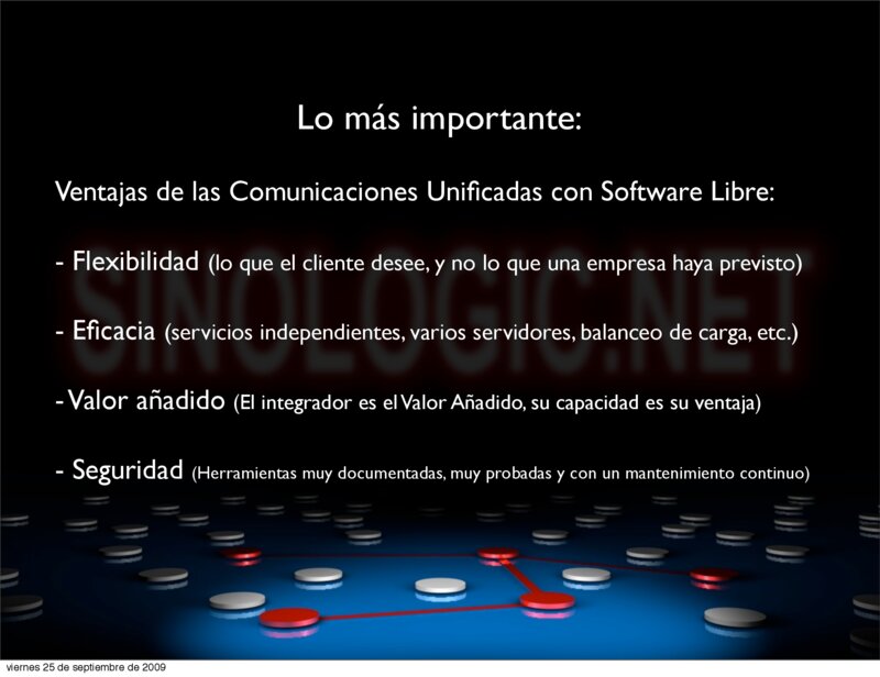 - Flexibilidad (lo que el cliente desee, y no lo que una empresa haya previsto) - Eficacia (servicios independientes, varios servidores, balanceo de carga, etc.) - Valor añadido (El integrador es el Valor Añadido, su capacidad es su ventaja) - Seguridad (Herramientas muy documentadas, muy probadas y con un mantenimiento continuo) Elio Rojano (http://www.sinologic.net) viernes 25 de septiembre de 2009