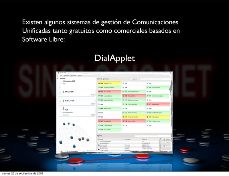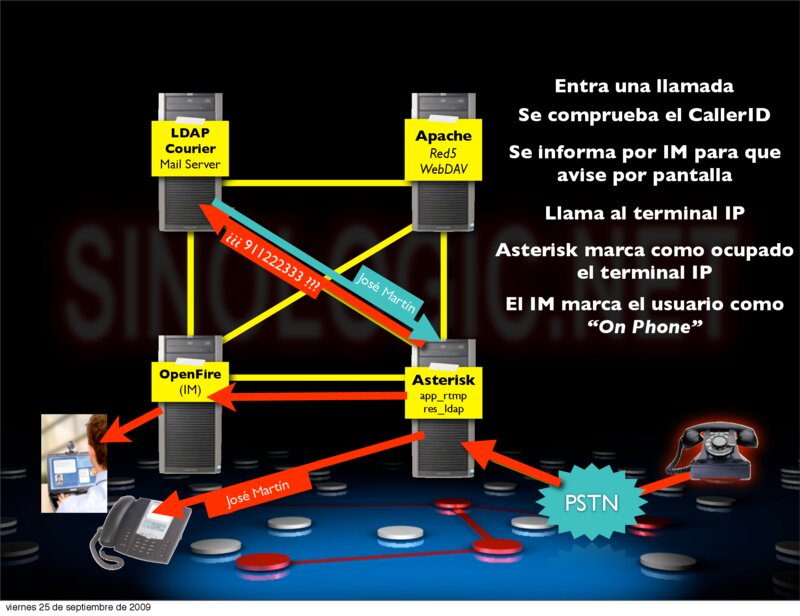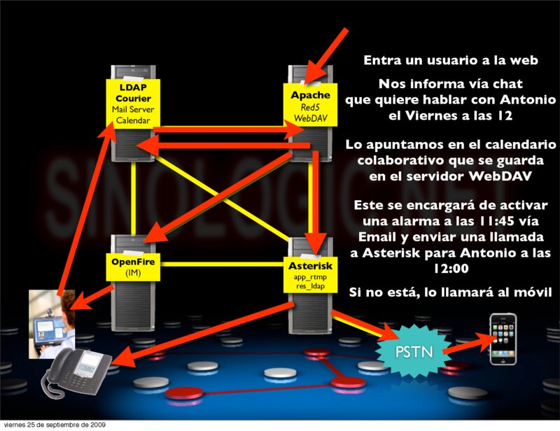 6.- Dimdim con Asterisk http://sourceforge.net/projects/dimdim/forums/forum/613324/topic/3376398?message=7579428 https://issues.asterisk.org/view.php?id=15484 7.- Realizando llamadas vía web http://npramesh.wordpress.com/2008/06/05/web-based-sip-phone-with-flex-java-and-red5-server/ 8.- Utilizando LDAP desde servidor PHP http://us2.php.net/manual/en/book.ldap.php 9.- Utilizando protocolos libres XMPP/Jabber para la mensajería instantánea basada en software libre para la comunicación con aplicaciones de terceros: (ejemplo: firefox, thunderbird, ... http://www.sameplace.cc/, y cualquier otra aplicación que desee utilizar este protocolo abierto y libre) 10.- Utilizando aplicaciones que soporten LDAP para la utilización de los datos de los contactos almacenados.