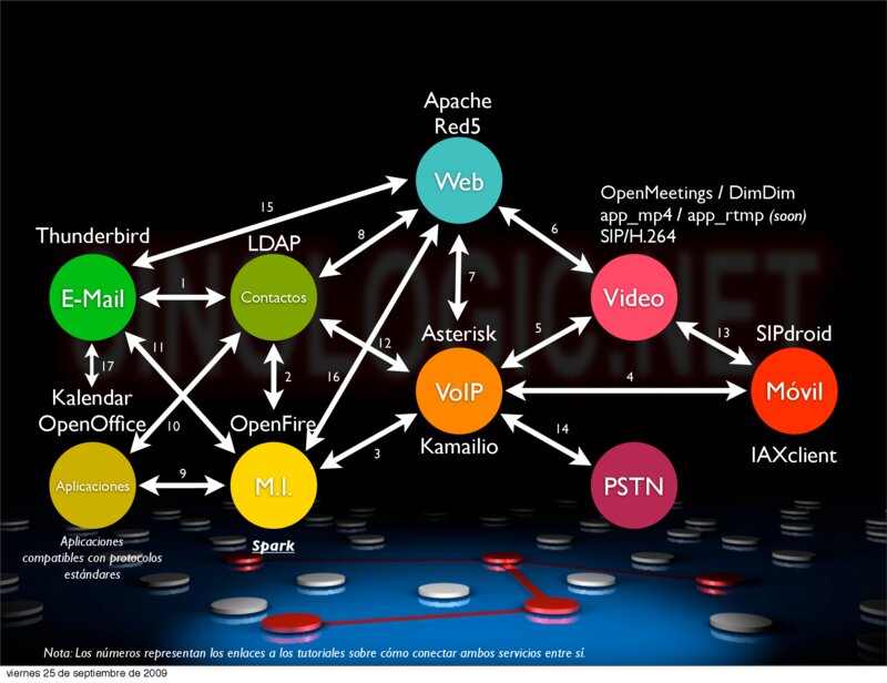 1 E-Mail 7 12 17 2 16 3 Aplicaciones Aplicaciones compatibles con protocolos estándares 9 Asterisk 5 13 4 VoIP OpenFire 10 Video Contactos 11 Kalendar OpenOffice 6 8 Kamailio SIPdroid Móvil 14