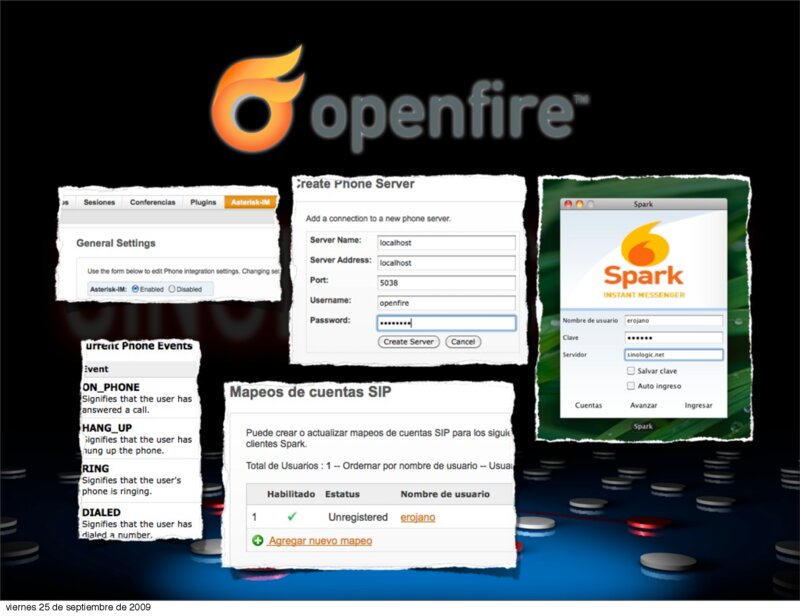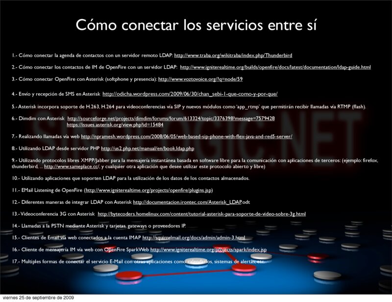 VoIP2DAY 2009 Comunicaciones Unificadas en grandes Infraestructuras Cómo conectar los servicios entre sí 1.- Cómo conectar la agenda de contactos con un servidor remoto LDAP: http://www.traba.org/wikitraba/index.php/Thunderbird 2.- Cómo conectar los contactos de IM de OpenFire con un servidor LDAP: http://www.igniterealtime.org/builds/openfire/docs/latest/documentation/ldap-guide.html 3.- Cómo conectar OpenFire con Asterisk (softphone y presencia): http://www.voztovoice.org/?q=node/59 4.- Envío y recepción de SMS en Asterisk http://odicha.wordpress.com/2009/06/30/chan_sebi-1-que-como-y-por-que/ 5.- Asterisk incorpora soporte de H.263, H.264 para videoconferencias vía SIP y nuevos módulos como ‘app_rtmp’ que permitirán recibir llamadas vía RTMP (flash).