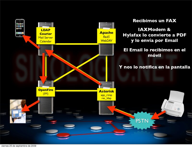 Courier Mail Server Calendar Apache Red5 WebDAV IAXModem & Hylafax lo convierte a PDF y lo envía por Email El Email lo recibimos en el móvil Y nos lo notifica en la pantalla OpenFire