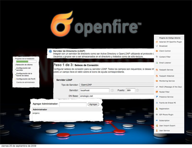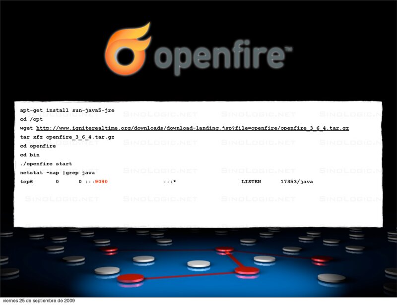 VoIP2DAY 2009 Comunicaciones Unificadas en grandes Infraestructuras apt-get install sun-java5-jre cd /opt wget http://www.igniterealtime.org/downloads/download-landing.jsp?file=openfire/openfire_3_6_4.tar.gz tar xfz openfire_3_6_4.tar.gz cd openfire cd bin ./openfire start netstat -nap |grep java tcp6 0 0 :::9090 :::*