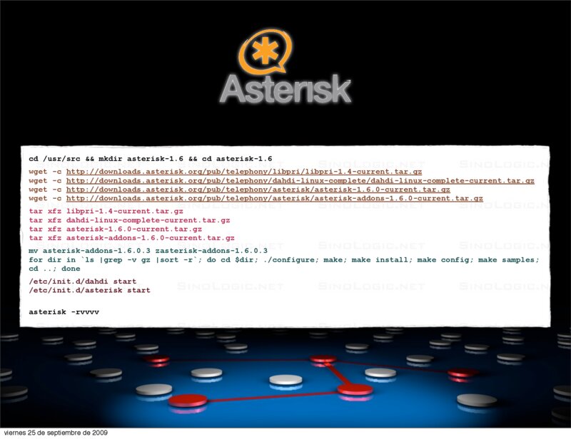 Comunicaciones Unificadas en grandes Infraestructuras VoIP2DAY 2009 cd /usr/src && mkdir asterisk-1.6 && cd asterisk-1.6 wget -c http://downloads.asterisk.org/pub/telephony/libpri/libpri-1.4-current.tar.gz wget -c http://downloads.asterisk.org/pub/telephony/dahdi-linux-complete/dahdi-linux-complete-current.tar.gz wget -c http://downloads.asterisk.org/pub/telephony/asterisk/asterisk-1.6.0-current.tar.gz wget -c http://downloads.asterisk.org/pub/telephony/asterisk/asterisk-addons-1.6.0-current.tar.gz tar xfz libpri-1.4-current.tar.gz tar xfz dahdi-linux-complete-current.tar.gz tar xfz asterisk-1.6.0-current.tar.gz tar xfz asterisk-addons-1.6.0-current.tar.gz mv asterisk-addons-1.6.0.3 zasterisk-addons-1.6.0.3 for dir in `ls |grep -v gz |sort -r`; do cd $dir; ./configure; make; make install; make config; make samples; cd ..; done /etc/init.d/dahdi start /etc/init.d/asterisk start asterisk -rvvvv Elio Rojano (http://www.sinologic.net) viernes 25 de septiembre de 2009