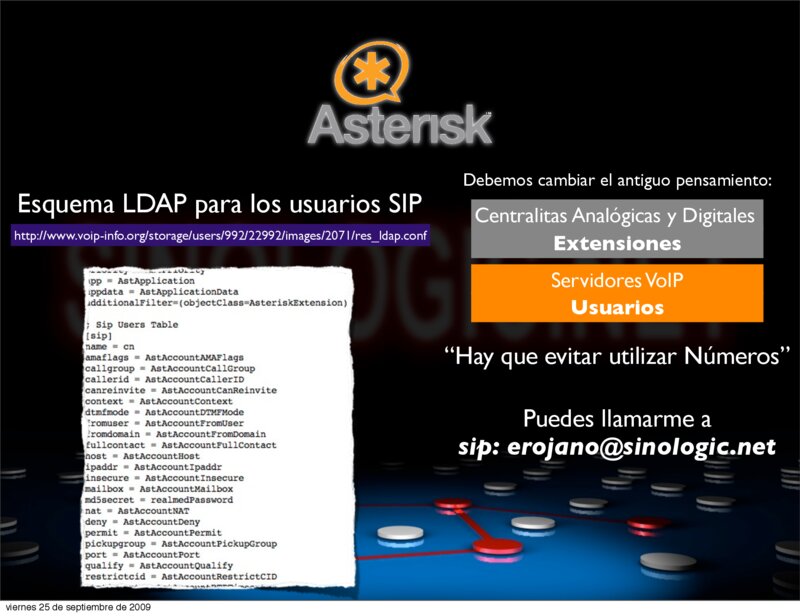 VoIP2DAY 2009 Comunicaciones Unificadas en grandes Infraestructuras Esquema LDAP para los usuarios SIP http://www.voip-info.org/storage/users/992/22992/images/2071/res_ldap.conf Debemos cambiar el antiguo pensamiento: