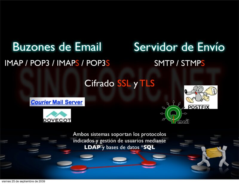 Cifrado SSL y TLS Ambos sistemas soportan los protocolos indicados y gestión de usuarios mediante LDAP y bases de datos *SQL Elio Rojano (http://www.sinologic.net) viernes 25 de septiembre de 2009
