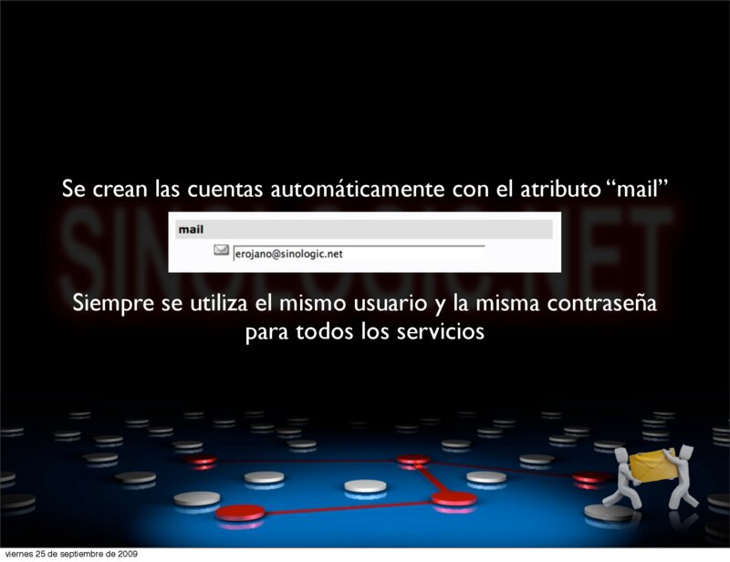 Comunicaciones Unificadas en grandes Infraestructuras VoIP2DAY 2009 Se crean las cuentas automáticamente con el atributo “mail” Siempre se utiliza el mismo usuario y la misma contraseña para todos los servicios Elio Rojano (http://www.sinologic.net) viernes 25 de septiembre de 2009