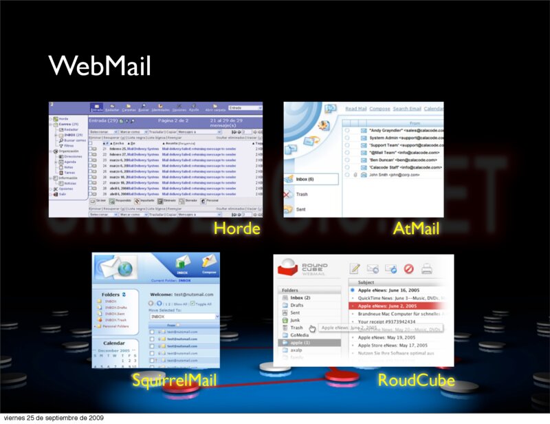 15.- Clientes de Email vía web conectados a la cuenta IMAP http://squirrelmail.org/docs/admin/admin-3.html 16.- Cliente de mensajería IM vía web con OpenFire SparkWeb http://www.igniterealtime.org/projects/spark/index.jsp 17.- Multiples formas de conectar el servicio E-Mail con otras aplicaciones como calendarios, sistemas de alertas, etc.