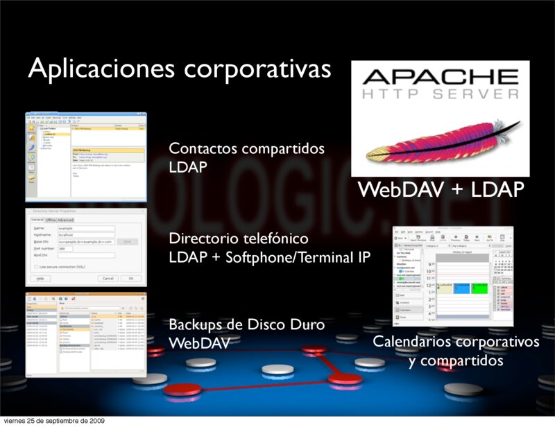 WebDAV + LDAP Directorio telefónico LDAP + Softphone/Terminal IP Backups de Disco Duro WebDAV Calendarios corporativos y compartidos Elio Rojano (http://www.sinologic.net) viernes 25 de septiembre de 2009