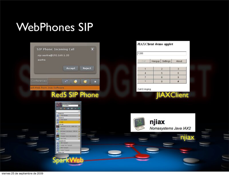 VoIP2DAY 2009 Comunicaciones Unificadas en grandes Infraestructuras WebPhones SIP Red5 SIP Phone JIAXClient njiax SparkWeb Elio Rojano (http://www.sinologic.net) viernes 25 de septiembre de 2009