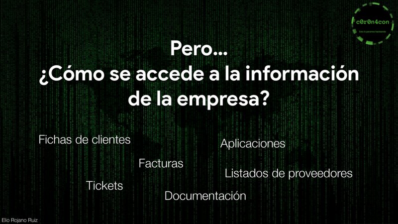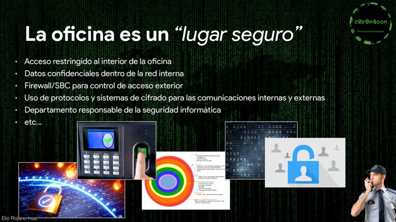 La oficina es un “lugar seguro” Acceso restringido al interior de la oficina Datos confidenciales dentro de la red interna Firewall/SBC para control de acceso exterior Uso de protocolos y sistemas de cifrado para las comunicaciones internas y externas Departamento responsable de la seguridad informática etc… Elio Rojano Ruiz