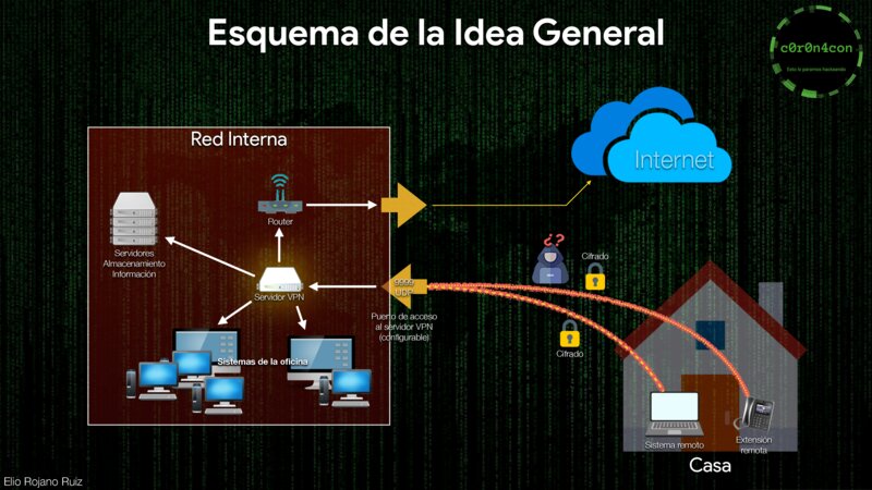 Cifrado Servidor VPN 9999 UDP Puerto de acceso al servidor VPN (configurable) Sistemas de la oficina Cifrado Sistema remoto Elio Rojano Ruiz Casa Extensión remota