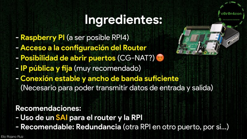 Ingredientes: - Raspberry PI (a ser posible RPI4) - Acceso a la configuración del Router - Posibilidad de abrir puertos (CG-NAT?) - IP pública y fija (muy recomendado) - Conexión estable y ancho de banda suficiente (Necesario para poder transmitir datos de entrada y salida) Recomendaciones: