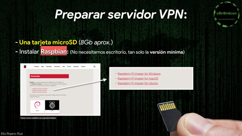 Preparar servidor VPN: - Una tarjeta microSD (8Gb aprox.) - Instalar Raspbian: (No necesitamos escritorio, tan solo la versión mínima) https://www.raspberrypi.org/downloads/ Elio Rojano Ruiz