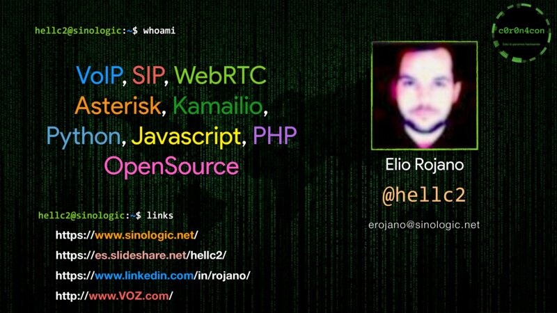 hellc2@sinologic:~$ whoami VoIP, SIP, WebRTC Asterisk, Kamailio, Python, Javascript, PHP OpenSource Elio Rojano @hellc2 hellc2@sinologic:~$ links https://www.sinologic.net/ https://es.slideshare.net/hellc2/ https://www.linkedin.com/in/rojano/ http://www.VOZ.com/ erojano@sinologic.net