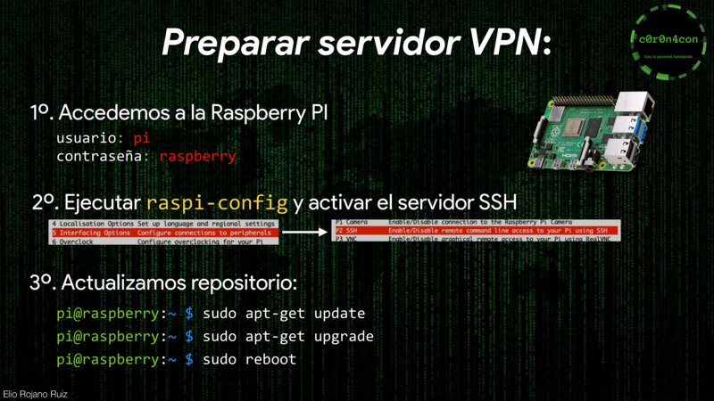 Preparar servidor VPN: 1º. Accedemos a la Raspberry PI usuario: pi contraseña: raspberry 2º. Ejecutar raspi-config y activar el servidor SSH 3º. Actualizamos repositorio: