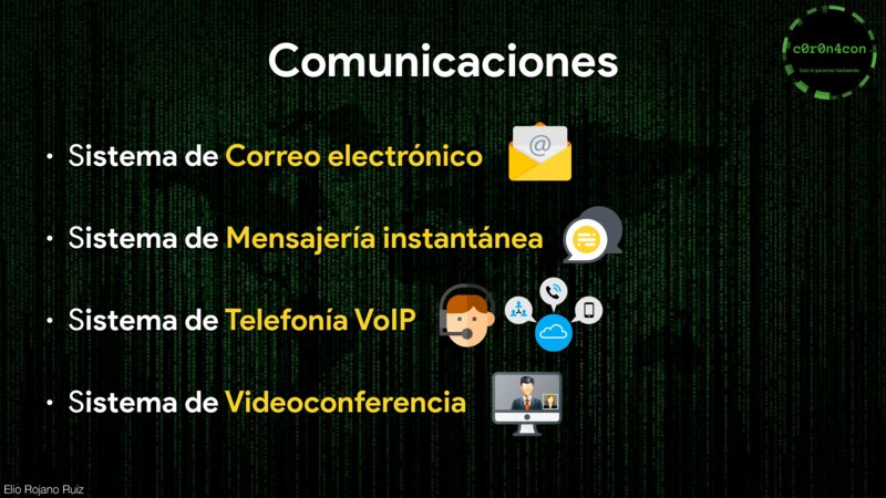 Comunicaciones • Sistema de Correo electrónico • Sistema de Mensajería instantánea • Sistema de Telefonía VoIP • Sistema de Videoconferencia Elio Rojano Ruiz