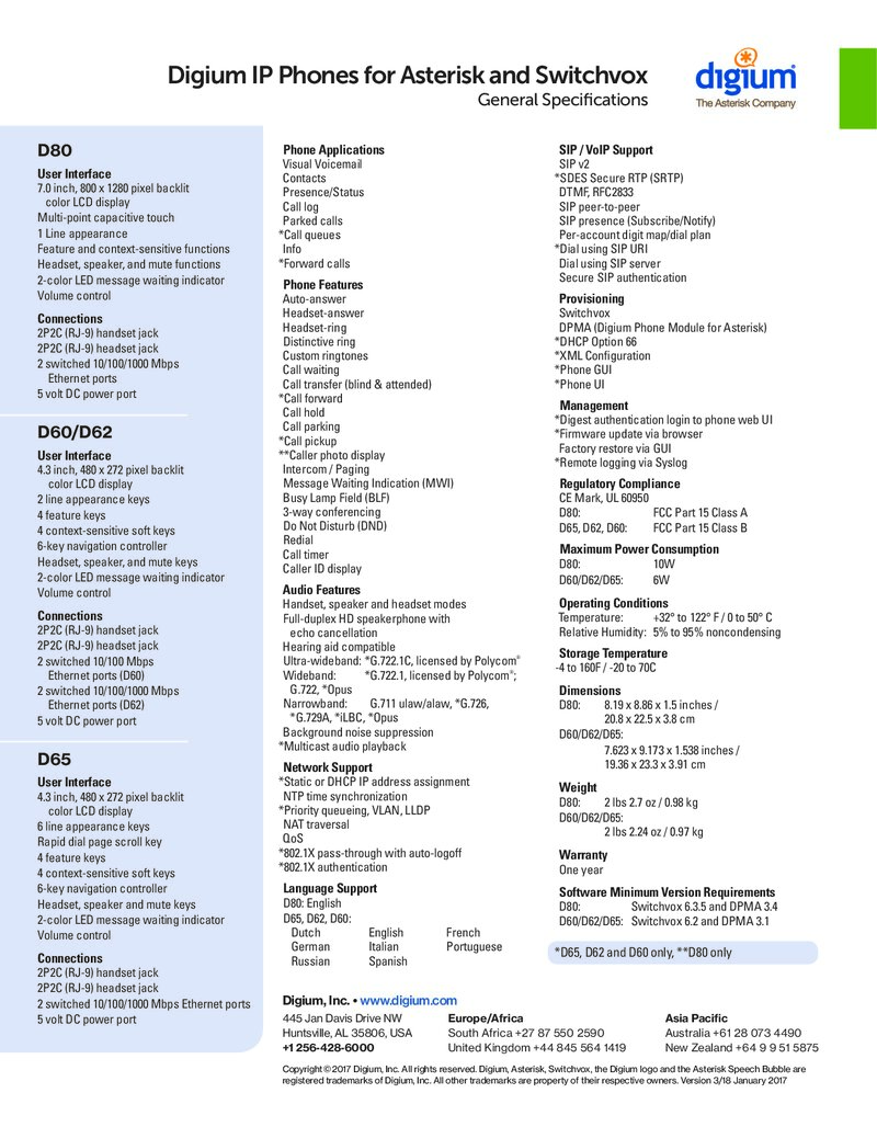 Switchvox 6.3.5 and DPMA 3.4 D60/D62/D65: Switchvox 6.2 and DPMA 3.1 *D65, D62 and D60 only, **D80 only Digium, Inc. • www.digium.com 445 Jan Davis Drive NW Huntsville, AL 35806, USA +1 256-428-6000 Europe/Africa South Africa +27 87 550 2590 United Kingdom +44 845 564 1419 Asia Pacific Australia +61 28 073 4490 New Zealand +64 9 9 51 5875 Copyright © 2017 Digium, Inc. All rights reserved. Digium, Asterisk, Switchvox, the Digium logo and the Asterisk Speech Bubble are registered trademarks of Digium, Inc. All other trademarks are property of their respective owners. Version 3/18 January 2017