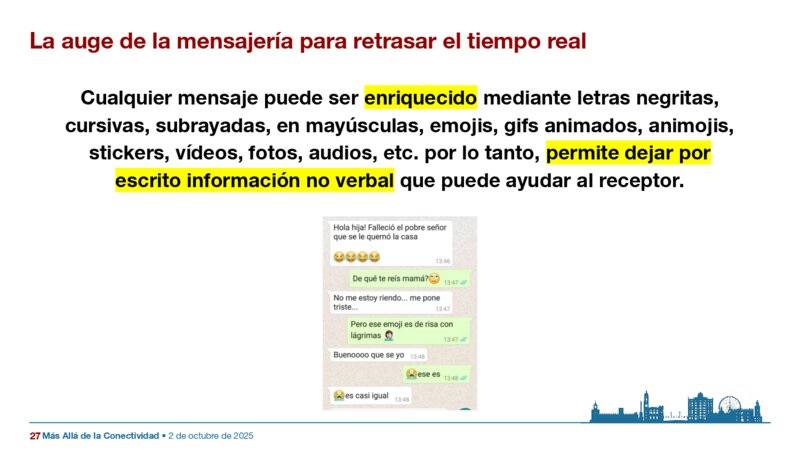 La auge de la mensajería para retrasar el tiempo real Cualquier mensaje puede ser enriquecido mediante letras negritas, cursivas, subrayadas, en mayúsculas, emojis, gifs animados, animojis, stickers, vídeos, fotos, audios, etc. por lo tanto, permite dejar por escrito información no verbal que puede ayudar al receptor.