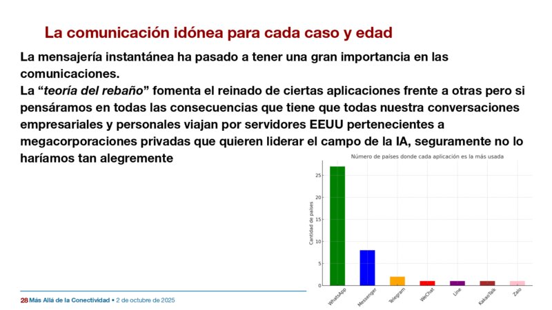 La “teoría del rebaño” fomenta el reinado de ciertas aplicaciones frente a otras pero si pensáramos en todas las consecuencias que tiene que todas nuestra conversaciones empresariales y personales viajan por servidores EEUU pertenecientes a megacorporaciones privadas que quieren liderar el campo de la IA, seguramente no lo haríamos tan alegremente 28 Más Allá de la Conectividad • 2 de octubre de 2025
