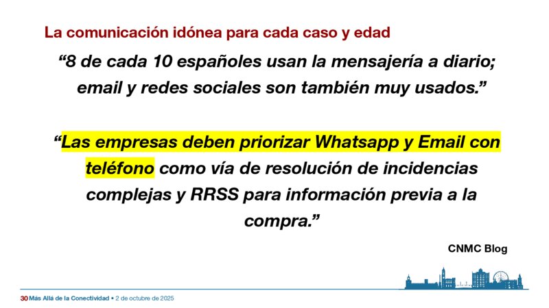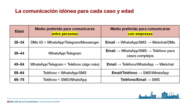 La comunicación idónea para cada caso y edad Edad Medio preferido para comunicarse entre personas Medio preferido para comunicarse con empresas 25–34 DMs IG + WhatsApp/Telegram/Messenger Email → WhatsApp/SMS → Webchat/DMs 35–44 WhatsApp/Telegram Email → WhatsApp/SMS → Teléfono para casos complejos 45–54 WhatsApp/Telegram + Teléfono (algo más) Email → Teléfono/WhatsApp → Webchat 55–64 Teléfono + WhatsApp/SMS Email/Teléfono → SMS/WhatsApp 65–75 Teléfono + SMS/WhatsApp Teléfono/Email → SMS 29 Más Allá de la Conectividad • 2 de octubre de 2025