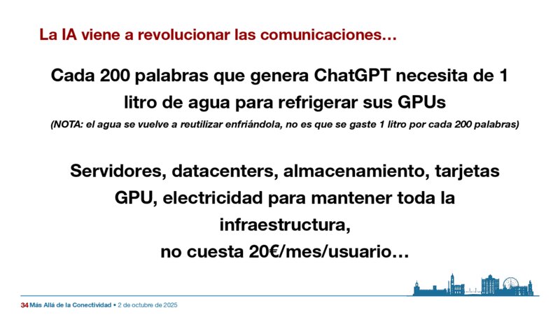 La IA viene a revolucionar las comunicaciones… Cada 200 palabras que genera ChatGPT necesita de 1 litro de agua para refrigerar sus GPUs (NOTA: el agua se vuelve a reutilizar enfriándola, no es que se gaste 1 litro por cada 200 palabras) Servidores, datacenters, almacenamiento, tarjetas GPU, electricidad para mantener toda la infraestructura, no cuesta 20€/mes/usuario… 34 Más Allá de la Conectividad • 2 de octubre de 2025