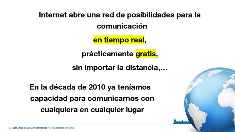 Internet abre una red de posibilidades para la comunicación en tiempo real, prácticamente gratis, sin importar la distancia,… En la década de 2010 ya teníamos capacidad para comunicarnos con cualquiera en cualquier lugar 8 Más Allá de la Conectividad • 2 de octubre de 2025