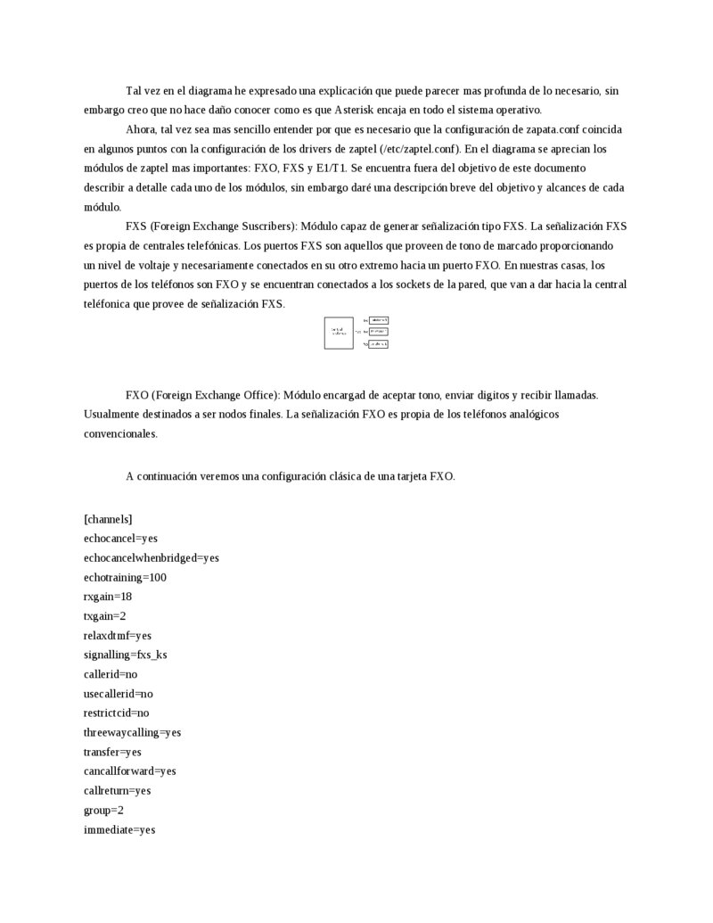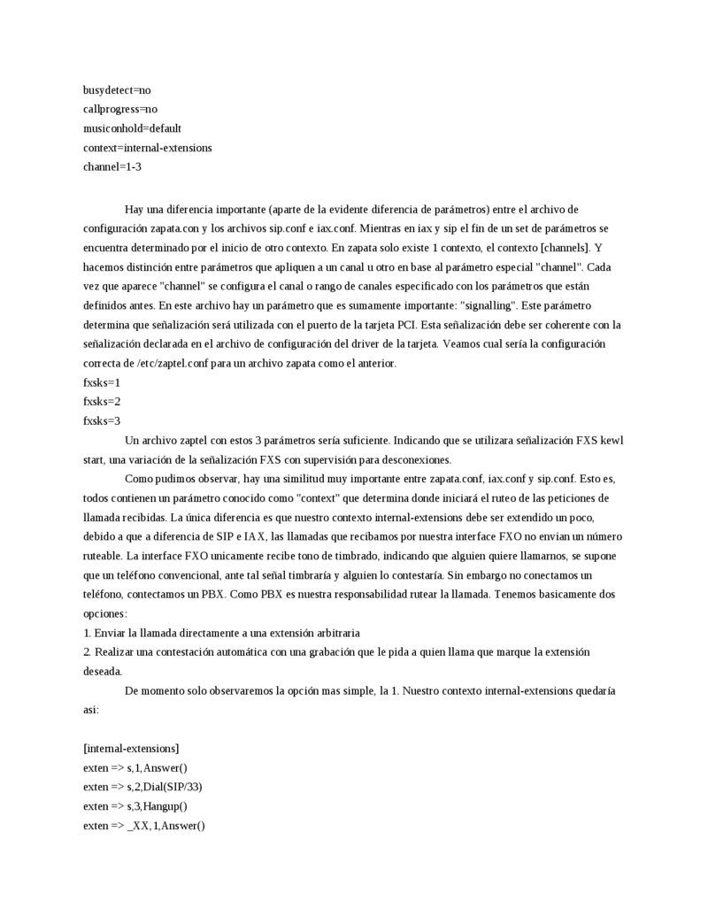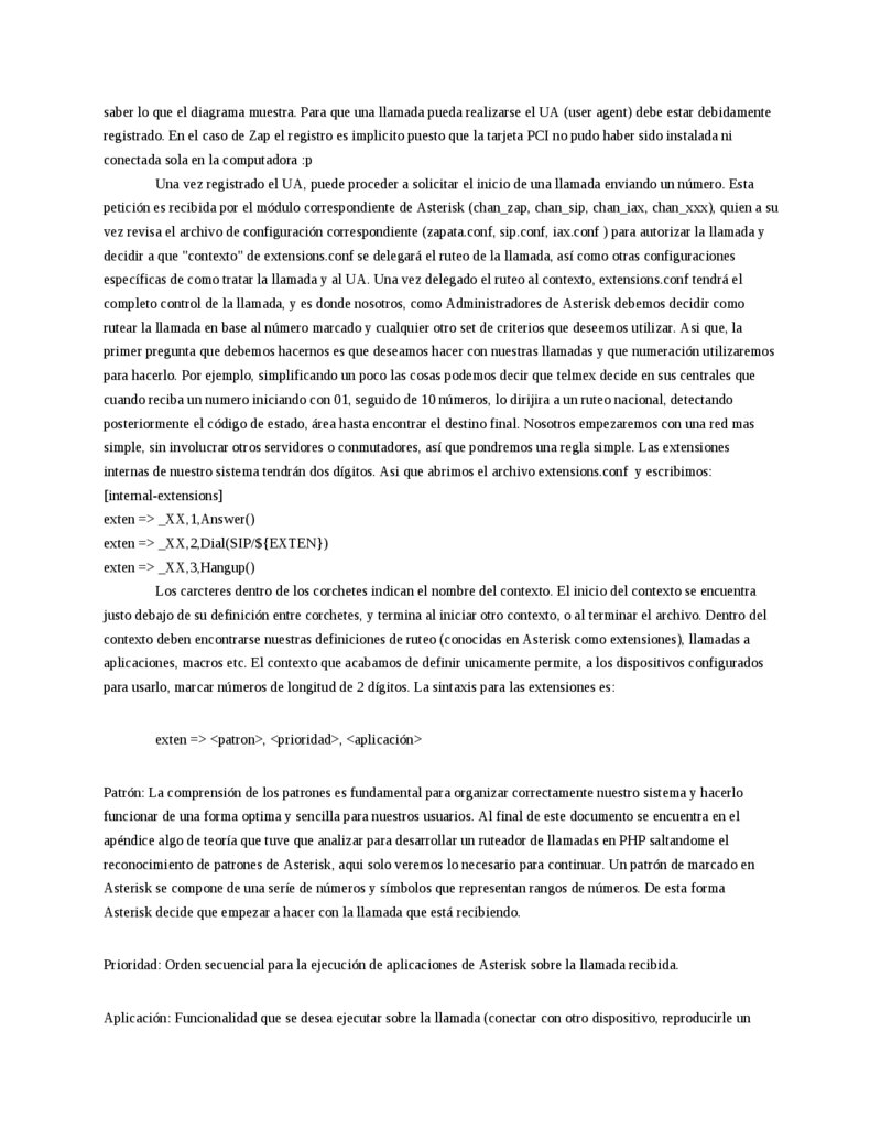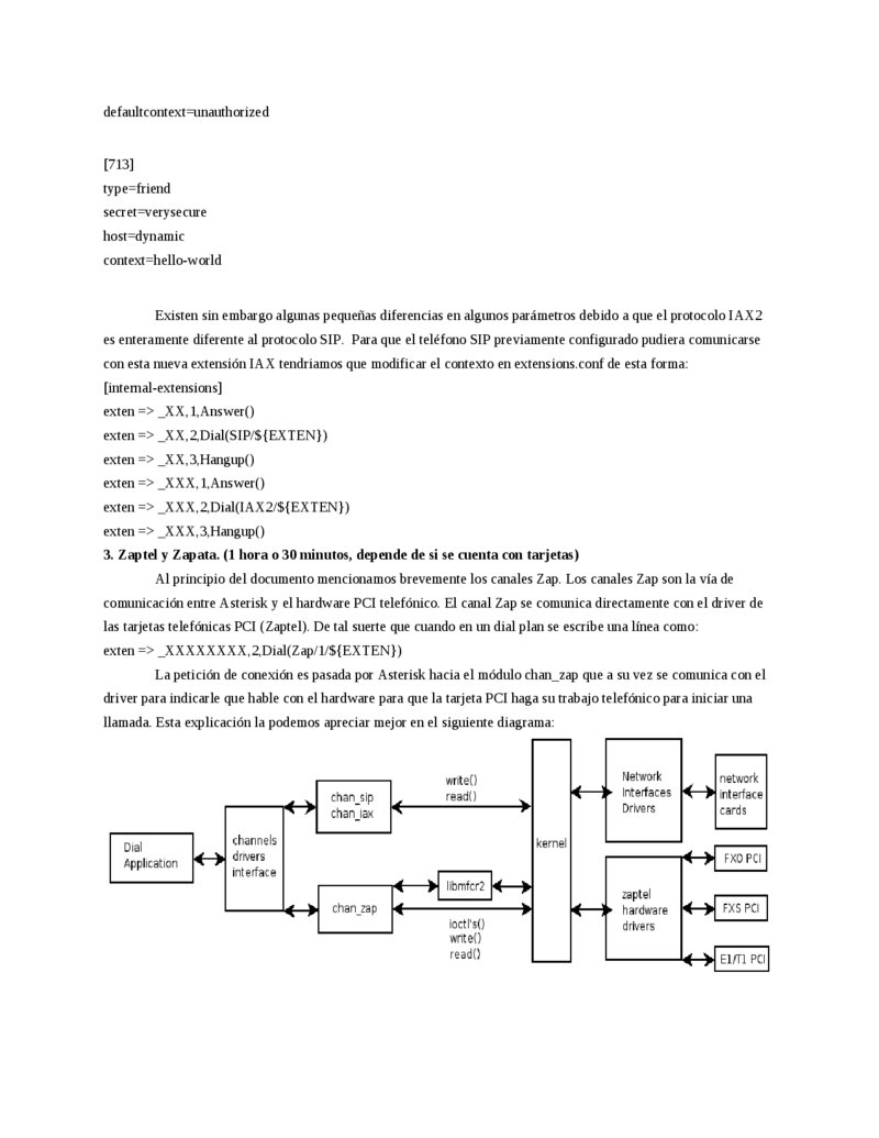 [internal-extensions] exten => _XX,1,Answer() exten => _XX,2,Dial(SIP/${EXTEN}) exten => _XX,3,Hangup() exten => _XXX,1,Answer() exten => _XXX,2,Dial(IAX2/${EXTEN}) exten => _XXX,3,Hangup() 3. Zaptel y Zapata. (1 hora o 30 minutos, depende de si se cuenta con tarjetas) Al principio del documento mencionamos brevemente los canales Zap. Los canales Zap son la vía de comunicación entre Asterisk y el hardware PCI telefónico. El canal Zap se comunica directamente con el driver de las tarjetas telefónicas PCI (Zaptel). De tal suerte que cuando en un dial plan se escribe una línea como: