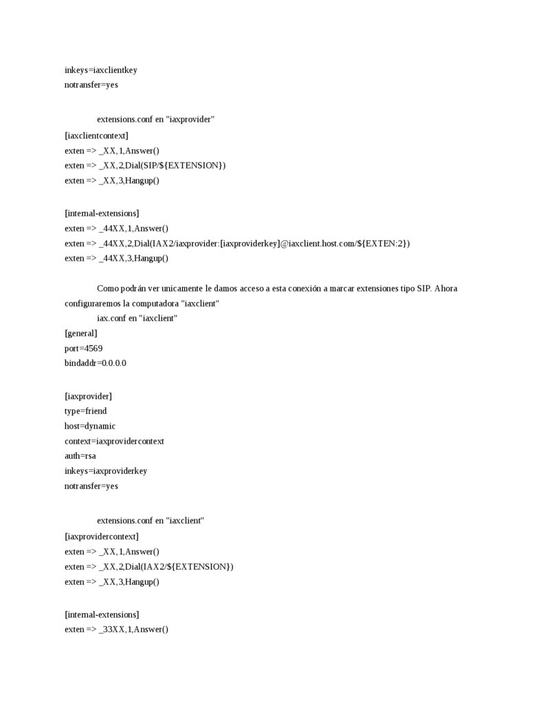 inkeys=iaxclientkey notransfer=yes extensions.conf en "iaxprovider" [iaxclientcontext] exten => _XX,1,Answer() exten => _XX,2,Dial(SIP/${EXTENSION}) exten => _XX,3,Hangup() [internal-extensions] exten => _44XX,1,Answer() exten => _44XX,2,Dial(IAX2/iaxprovider:[iaxproviderkey]@iaxclient.host.com/${EXTEN:2}) exten => _44XX,3,Hangup() Como podrán ver unicamente le damos acceso a esta conexión a marcar extensiones tipo SIP. Ahora configuraremos la computadora "iaxclient" iax.conf en "iaxclient" [general] port=4569 bindaddr=0.0.0.0 [iaxprovider] type=friend host=dynamic context=iaxprovidercontext auth=rsa inkeys=iaxproviderkey notransfer=yes extensions.conf en "iaxclient" [iaxprovidercontext] exten => _XX,1,Answer() exten => _XX,2,Dial(IAX2/${EXTENSION}) exten => _XX,3,Hangup() [internal-extensions] exten => _33XX,1,Answer()