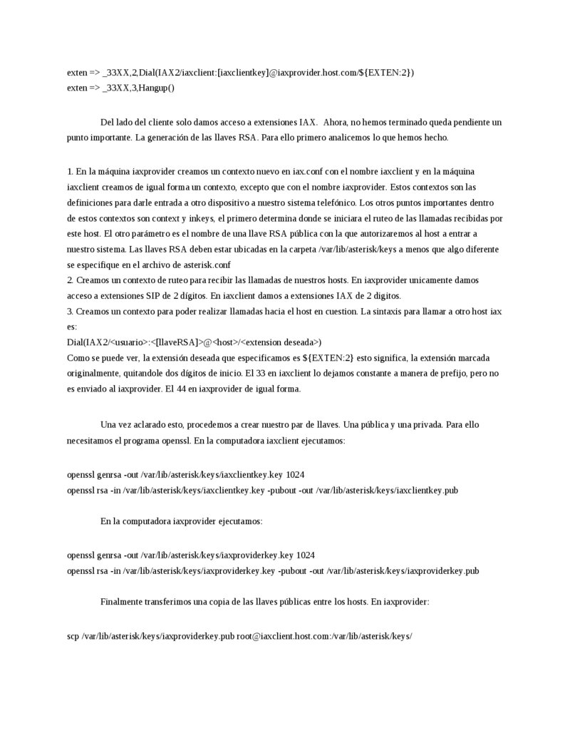 exten => _33XX,2,Dial(IAX2/iaxclient:[iaxclientkey]@iaxprovider.host.com/${EXTEN:2}) exten => _33XX,3,Hangup() Del lado del cliente solo damos acceso a extensiones IAX. Ahora, no hemos terminado queda pendiente un punto importante. La generación de las llaves RSA. Para ello primero analicemos lo que hemos hecho.