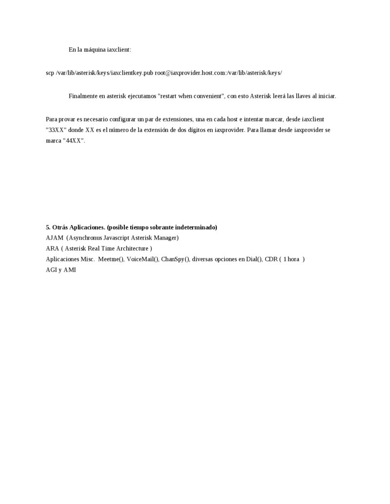 openssl genrsa -out /var/lib/asterisk/keys/iaxproviderkey.key 1024 openssl rsa -in /var/lib/asterisk/keys/iaxproviderkey.key -pubout -out /var/lib/asterisk/keys/iaxproviderkey.pub Finalmente transferimos una copia de las llaves públicas entre los hosts. En iaxprovider:
