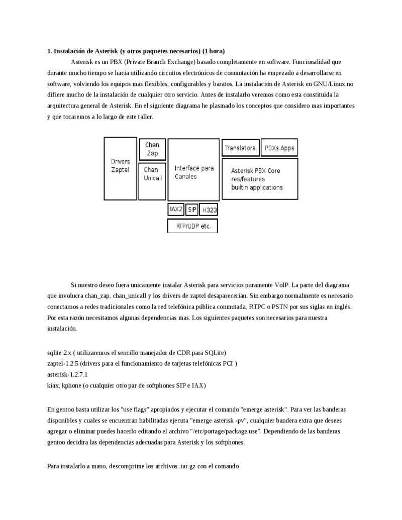 1. Instalación de Asterisk (y otros paquetes necesarios) (1 hora) Asterisk es un PBX (Private Branch Exchange) basado completamente en software. Funcionalidad que durante mucho tiempo se hacia utilizando circuitos electrónicos de conmutación ha empezado a desarrollarse en software, volviendo los equipos mas flexibles, configurables y baratos. La instalación de Asterisk en GNU/Linux no difiere mucho de la instalación de cualquier otro servicio. Antes de instalarlo veremos como esta constituida la arquitectura general de Asterisk. En el siguiente diagrama he plasmado los conceptos que considero mas importantes y que tocaremos a lo largo de este taller.