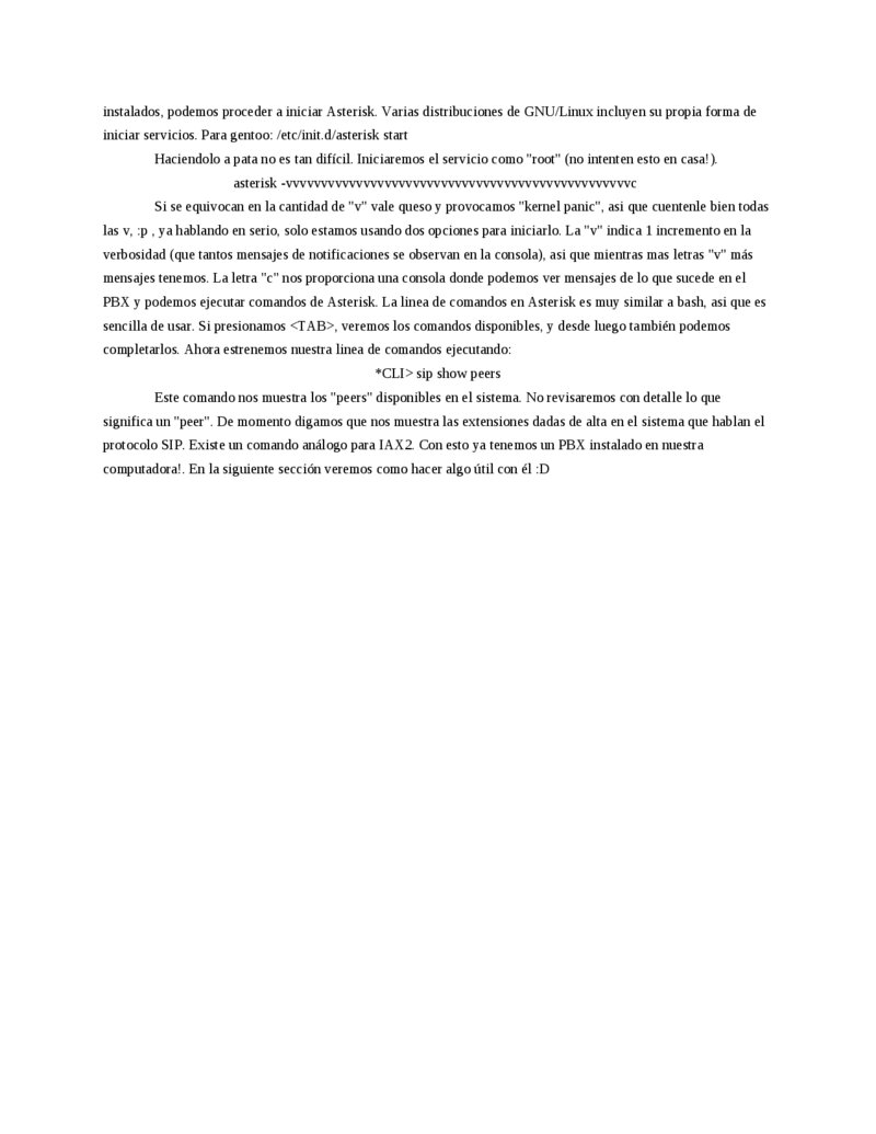instalados, podemos proceder a iniciar Asterisk. Varias distribuciones de GNU/Linux incluyen su propia forma de iniciar servicios. Para gentoo: /etc/init.d/asterisk start Haciendolo a pata no es tan difícil. Iniciaremos el servicio como "root" (no intenten esto en casa!).