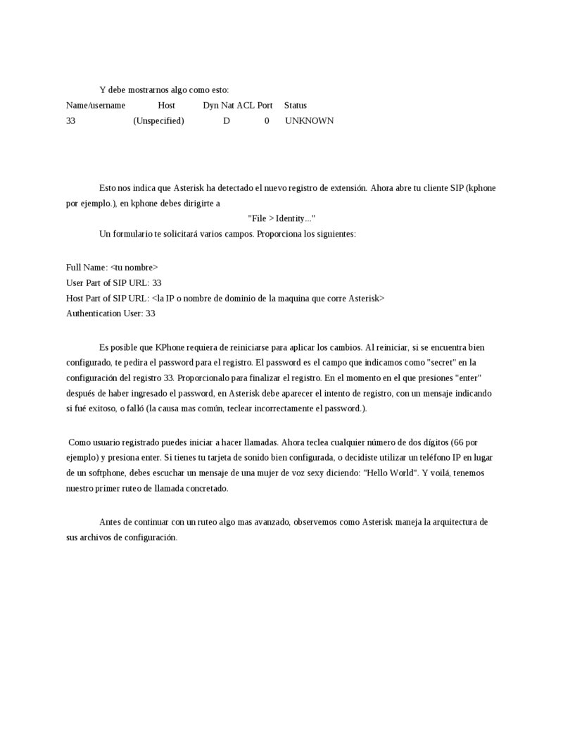 [general] [general] bindport=5060 bindaddr = 0.0.0.0 localnet = 192.168.1.0/24 ; aqui va la direccion de la red en la que te encuentras allow=all defaultcontext=unauthorized [33] type=friend secret=verysecure host=dynamic nat=no dtmfmode=info qualify=yes context=hello-world Fijate que el parámetro "context" del registro [33] debe coincidir con el contexto que agregamos en extensions.conf. Ahora, como Asterisk guarda sus archivos de configuración en memoria al iniciar, los cambios que hemos hecho no han sido detectados. Para ello nos dirigimos a la consola y escribimos: