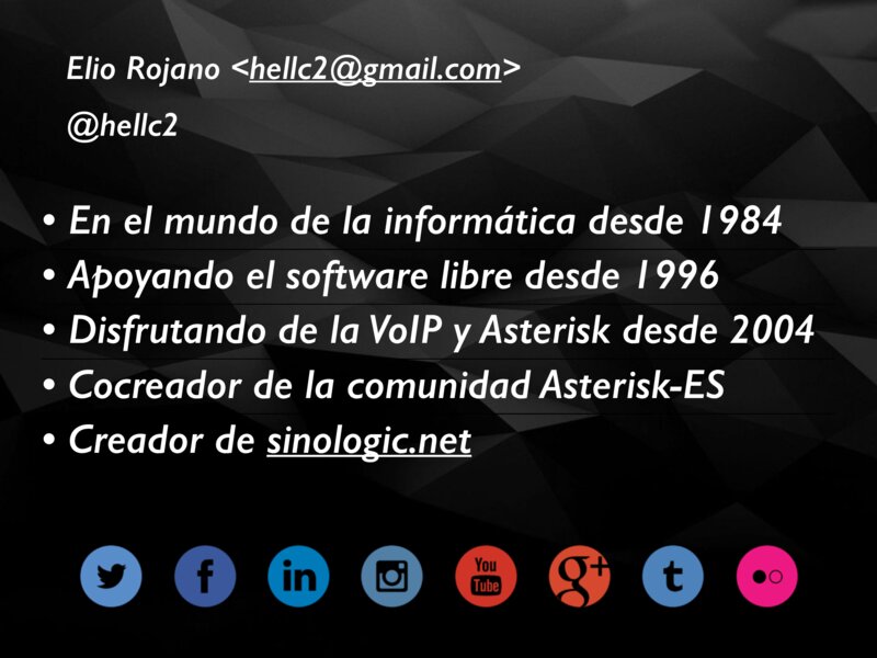 Elio Rojano <hellc2@gmail.com> @hellc2 • En el mundo de la informática desde 1984 • Apoyando el software libre desde 1996 • Disfrutando de la VoIP y Asterisk desde 2004 • Cocreador de la comunidad Asterisk-ES • Creador de sinologic.net