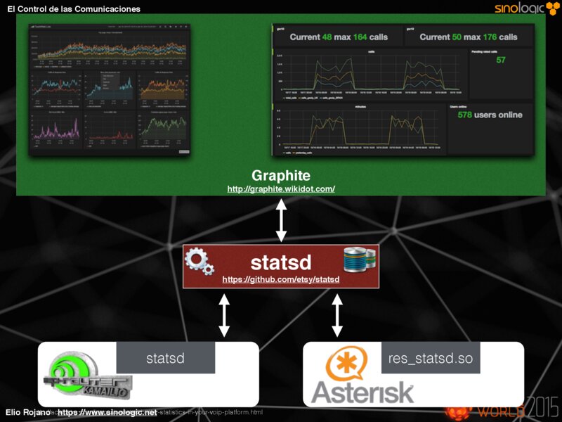 El Control de las Comunicaciones Graphite http://graphite.wikidot.com/ statsd https://github.com/etsy/statsd statsd http://acalustra.com/kamailio-statsd-better-statistics-in-your-voip-platform.html Elio Rojano https://www.sinologic.net res_statsd.so