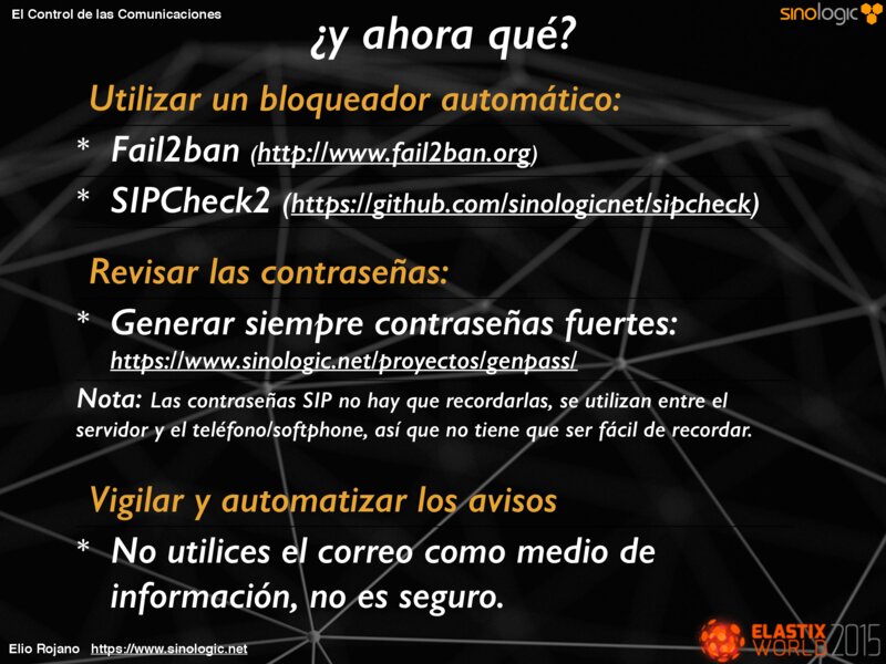 Utilizar un bloqueador automático: * Fail2ban (http://www.fail2ban.org) * SIPCheck2 (https://github.com/sinologicnet/sipcheck) Revisar las contraseñas: