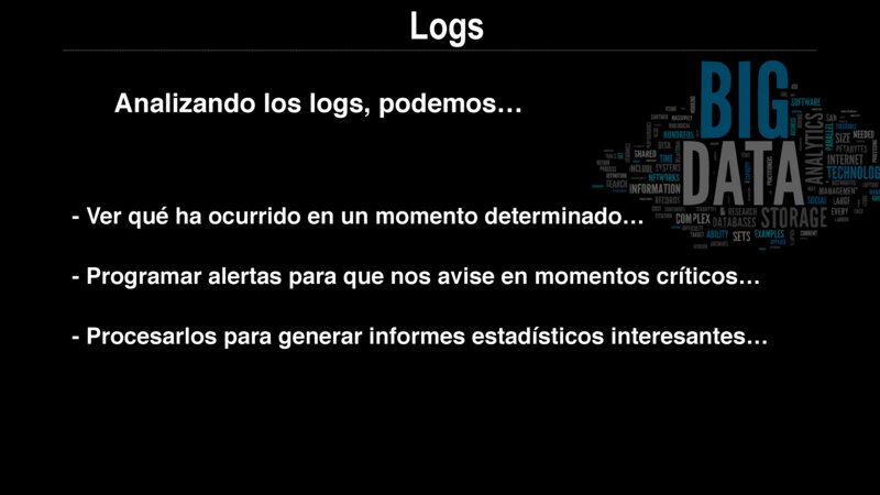 Logs Analizando los logs, podemos… - Ver qué ha ocurrido en un momento determinado… - Programar alertas para que nos avise en momentos críticos… - Procesarlos para generar informes estadísticos interesantes…