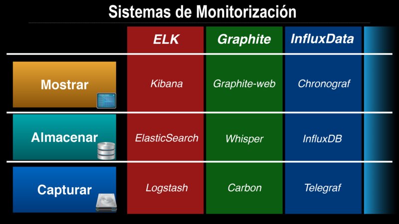 Sistemas de Monitorización ELK Graphite InfluxData Mostrar Kibana Graphite-web Chronograf Almacenar ElasticSearch Whisper InfluxDB Capturar Logstash Carbon Telegraf